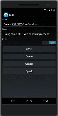 برنامه ی مذکور قابلیت لیست کردن، اضافه کردن، حذف کردن و به روز رسانی تعدادی To-Do item را دارد. هر کدام از این آیتم ها از property هایی با نام های ID، Name و Notes تشکیل شده است. همچنین یک property با نام Done که مشخص کننده ی این موضوع است که آیا یک To-Do item انجام شده است یا نه. همانطور که در تصویر بالا مشاهده کردید view ابتدایی برنامه یک لیست از ایتم ها را نشان می دهد و همچنین مشخص می کند که آیا یک ایتم انجام شده است یا نه. با استفاده از دکمه ی + که در قسمت بالایی صفحه مشاهده می کنید می توانید یک To-Do item جدید اضافه کنید. این موضوع در تصویر زیر نشان داده شده است.