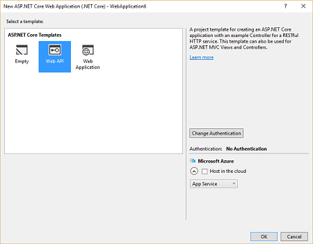 به منظور ساخت پروژه ی ASP.NET ای که قرار است در این آموزش از آن استفاده کنیم، در ویژوال استادیو با یک ASP.NET Core Web Application بسازید و در پنچره ی دوم شبیه تصویر زیر Web API را و No Authentication را انتخاب کنید. نام پروژه را ToDoApi بگذارید.