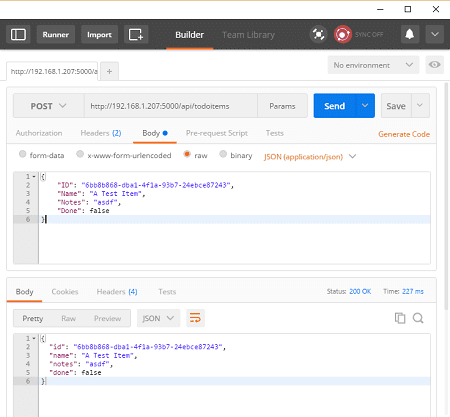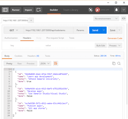 در این متد یک response code به صورت 200 OK به همراه تمامی ToDoItem هایی که serialize شده اند برگردانده می شود. در رابطه با serialization توصیه می کنیم حتماً آموزش سریالیزیشن Serialization در سی شارپ را استفاده کنید. ضمناً، شبیه تصویر زیر از Postman به منظور تست کردن Web API ای که تا اینجا ساخته ایم استفاده می کنیم.