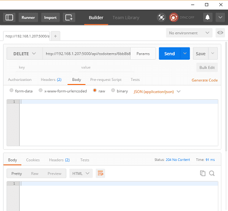 دیلیت کردن ایتم ها با ارسال یک DELETE request به سرویس انجام می شود. ضمناً، باید ID آن ایتمی که قصد حذف کردن آن را داریم نیز ارسال کنیم. اگر ایتمی که قصد حذف کردن آن را داریم موجود نباشد شبیه به قبل یک NotFound response دریافت خواهیم کرد و اگر عملیات حذف با موفقیت انجام شود یک NoContent (204) response دریافت خواهیم کرد. کد زیر مربوط به متد Delete می باشد.