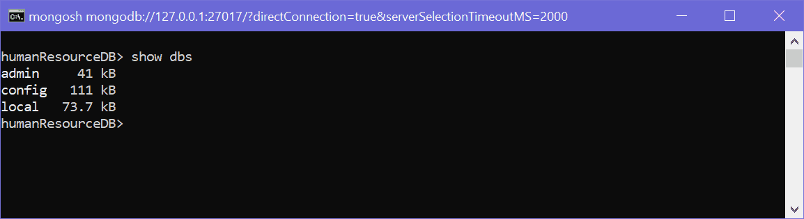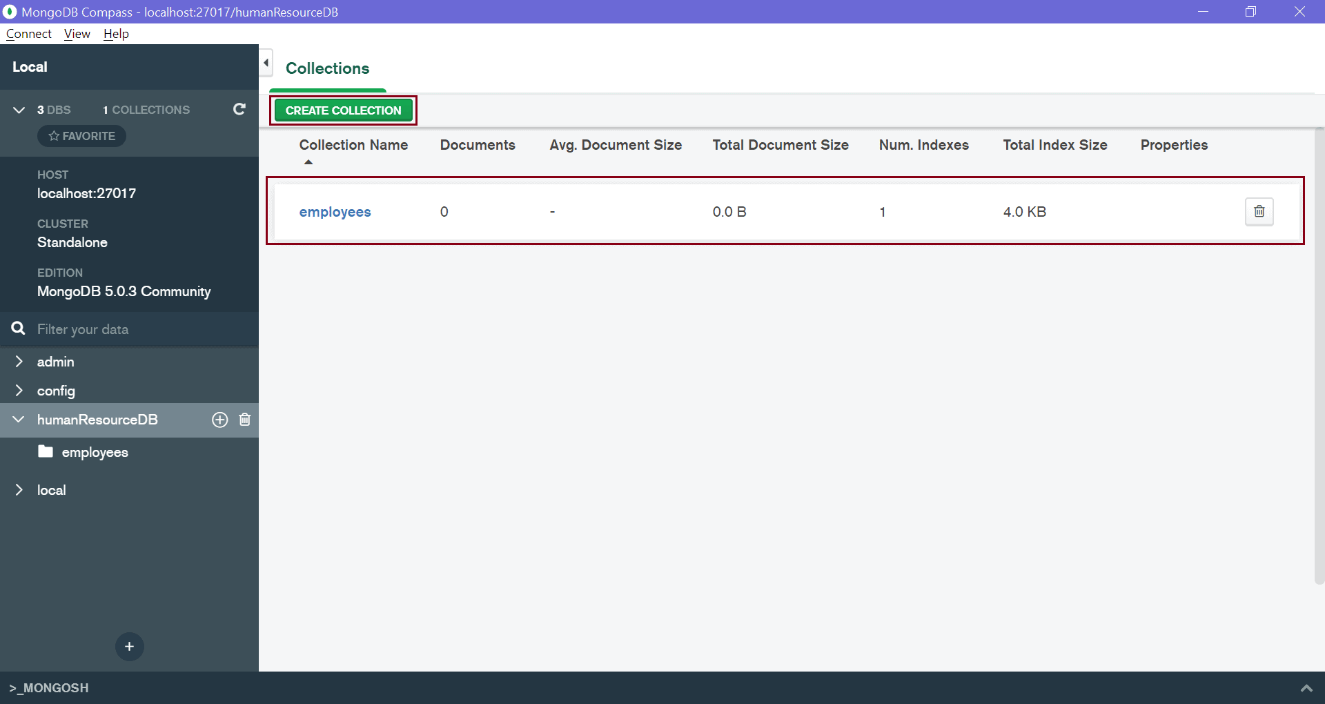همانطور که در قسمت بالا می بینید admin و config و local دیتابیس های پیش فرض و یا اصطلاحاً default هستند. در حال حاضر دیتابیس humanResourceDB در تصویر نشان داده نشده است. دلیل این موضوع نیز آن است که در این دیتابیس در حال حاضر هیچ کالکشنی تعریف نشده است.
