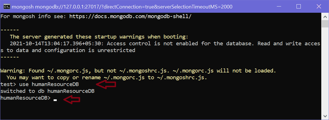 برای مثال، دستوری که در قسمت زیر مشخص شده است شروع به استفاده کردن یک دیتابیس به نام humanResouredb خواهد کرد. ضمنا اگر این دیتابیس از قبل وجود نداشته باشد MongoDB آن را ایجاد می کند.