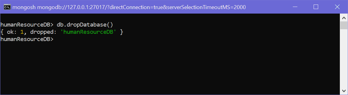 در قسمت بالا خروجی { ok: 1, dropped: ‘humanResourcedb’ } مشخص کننده آن است که دیتابیس مورد نظر با موفقیت حذف شده است.