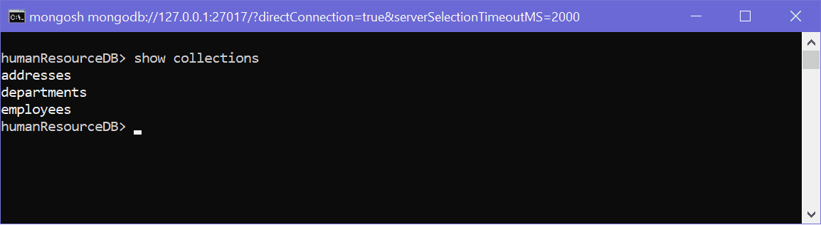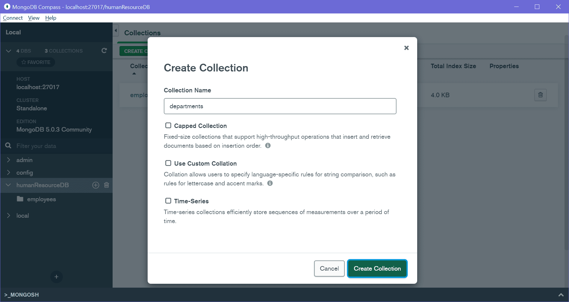 برای ایجاد کردن یک کالکشن از دستور ()db.createCollection استفاده نمایید. چیزی که در ادامه خواهید دید نحوه ایجاد کردن یک کالکشن جدید به اسم employees در دیتابیس فعلی که نام آن humanResourceDB می باشد را نشان میدهد. این دیتابیس را در قسمت قبلی از این آموزش ایجاد کردیم.